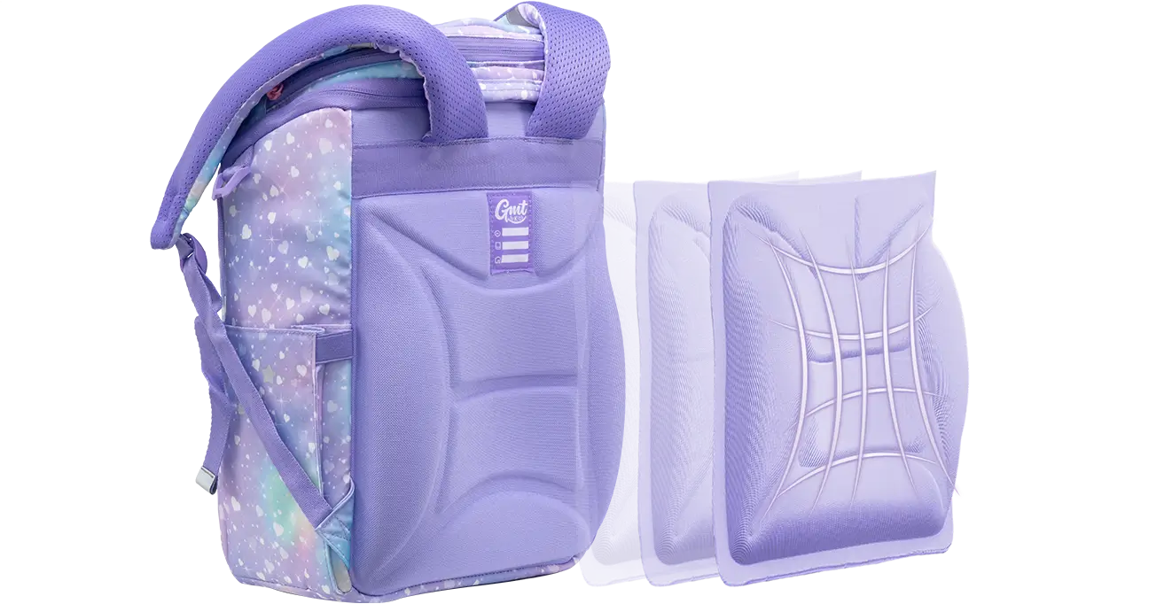 Wir wissen, wie wichtig die entscheidende Phase der gesunden Entwicklung der Wirbelsäule für Kinder ist. Alle GMT Schulranzen sind mit einem stromlinienförmigen, druckgeformten Rückenteil ausgestattet, das den Formen eines gesunden Kinderrückens nachempfunden ist. Beim Tragen passt sich der Schulranzen dem Rücken des Kindes an, verteilt das Gewicht effektiv auf die Muskeln beider Seiten und verringert den Druck auf die zentrale Wirbelsäule, was die Rückengesundheit schützt. Die Rückenplatte ist dick und stützend und schützt die Lendenwirbelsäule, während sie gleichzeitig den Druck und die Stoßbelastung reduziert und so Ermüdungserscheinungen oder Beschwerden durch ungleichmäßige Belastungen verringert. Gleichzeitig haben wir die Rückenplatte mit einer atmungsaktiven und komfortablen Zwei-Wege-Luftströmung ausgestattet, die den Rücken des Kindes trocken hält und für mehr Komfort sorgt.