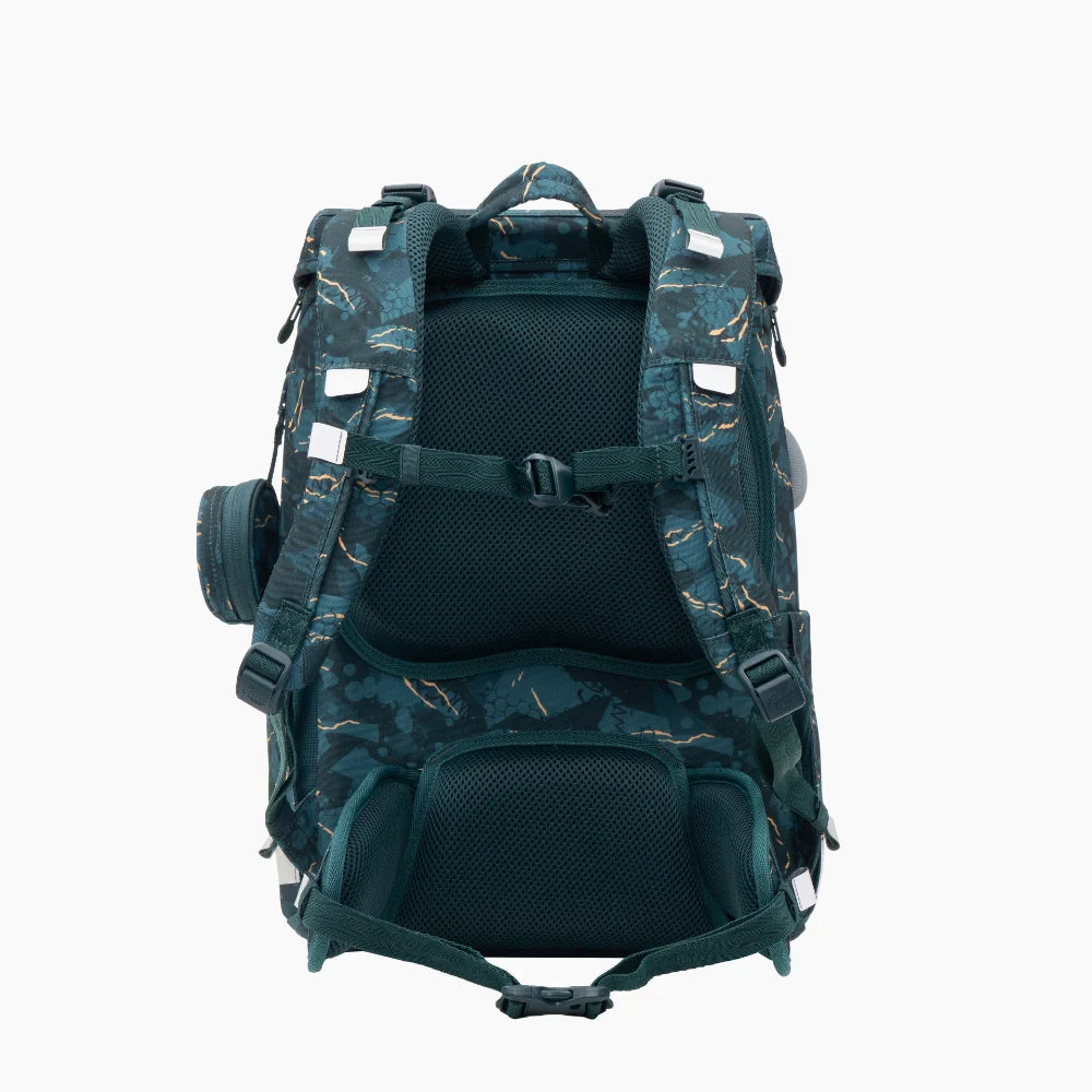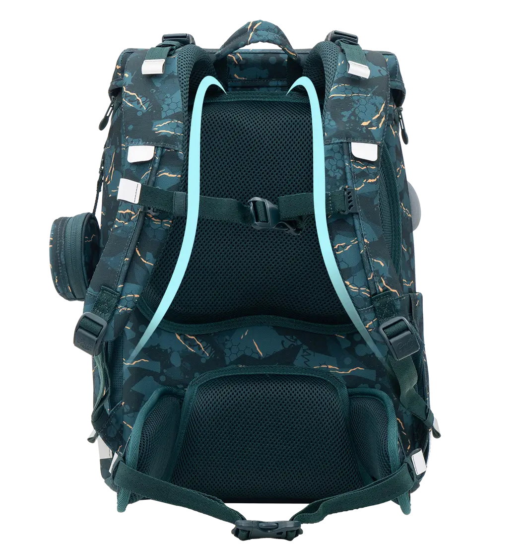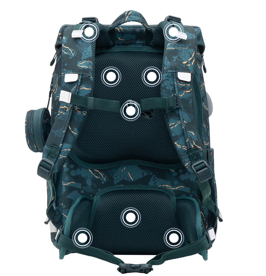 GMT WALL skolesekk - Den har en kapasitet på 23 liter med et romslig hovedrom, utvidbare sidelommer og en lett tilgjengelig frontlomme. Det robuste materialet sørger for langvarig bruk gjennom hele skoledagen, mens det myke, pustende ryggpanelet gir behagelig støtte under lange skoletimer. Tilpass skolesekken med seks borrelåsklistremerker slik at den passer til barnets personlige stil, og dra nytte av det åttepunkts ryggstøttesystemet som fremmer en sunn holdning.